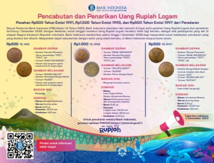 9Info.co.id | BATAM – Bank Indonesia mencabut dan menarik uang Rupiah logam pecahan Rp500 Tahun Emisi (TE) 1991, Rp1.000 TE 1993, dan Rp500 TE 1997 dari peredaran, melalui Peraturan Bank Indonesia (PBI) No.14 Tahun 2023, terhitung sejak 1 Desember 2023. Pencabutan dan penarikan uang Rupiah logam tersebut dilakukan dengan pertimbangan antara lain masa edar yang cukup lama dan perkembangan teknologi bahan/material uang logam. Dengan demikian, terhitung tanggal dimaksud uang Rupiah logam tersebut tidak lagi berlaku sebagai alat pembayaran yang sah di wilayah Negara Kesatuan Republik Indonesia.