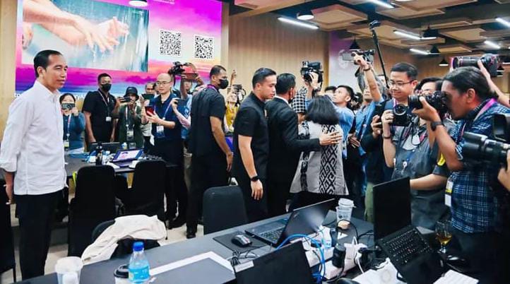 “Selamat siang semuanya,” ucap Presiden Jokowi seraya melambaikan tangan kepada para jurnalis setelah kemudian melihat area yang akan digunakan untuk menggelar konferensi pers, pusat penyiaran internasional, dilanjutkan area kerja jurnalis berikut fasilitas pendukungnya.